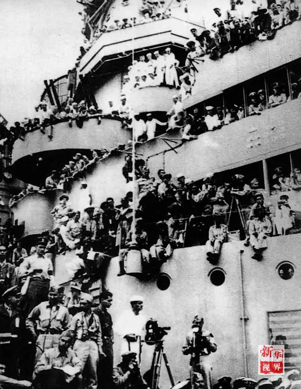 ↑“密苏里”号军舰上的水兵和摄影师们在等待着日本向盟军投降这一具有历史意义的瞬间。